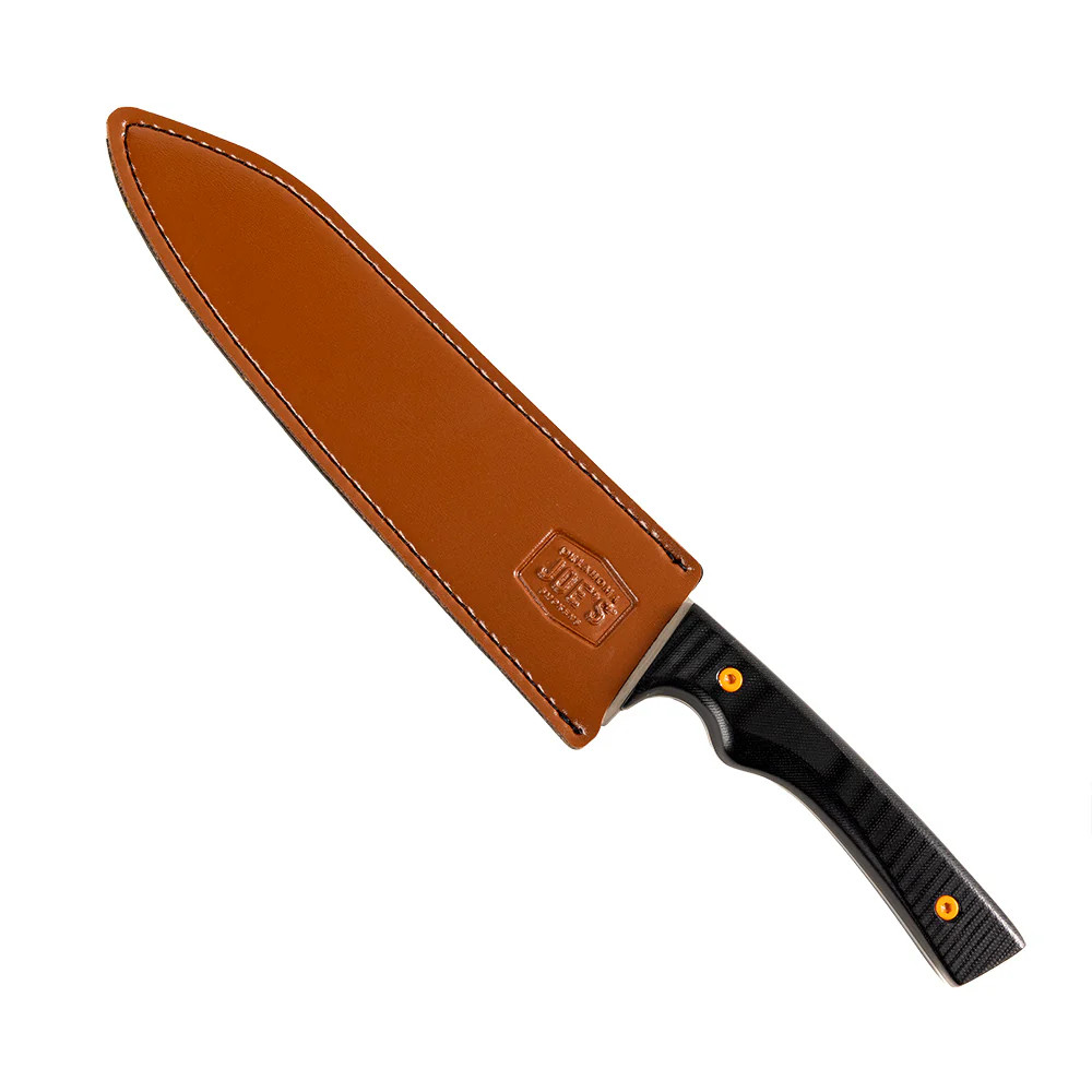 Crafted from high-carbon stainless steel with an ergonomic, riveted handle, it’s designed to feel natural in your hand and stay steady through every task, from slicing brisket ends to dicing onions for your smoker-side setup. The broad blade geometry offers confident cutting power without sacrificing finesse, making it an essential tool for building flavor at every step of the cook. Included is a leather-styled sheath for protection so the blade stays sharp, secure, and ready for whatever your next session at the smoker or grill demands.