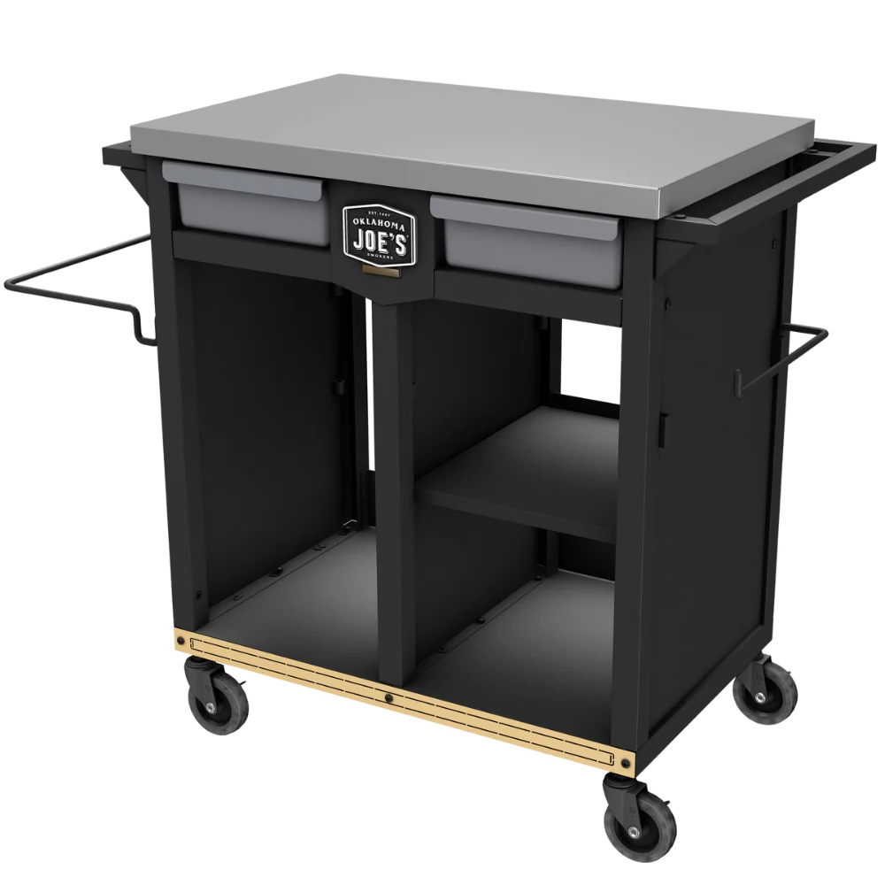 Roll out the rugged Oklahoma Joe’s® Workstation and you have everything you need for your cook, from prep to cleanup. Tools, accessories and spices stored in bins under the countertop are at the ready to season, slice and chop your food.  With wood, charcoal and pellet buckets stacked neatly, you always have plenty of fuel on hand. When you’re all done, you can drop the scraps over the side into the trash bag and quickly wipe down the work surface.